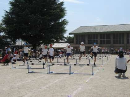 4・5・6年生のハードル走です。(写真 上から4年・5年・6年です)初めてハードルを経験する4年生から,今年で3年目になる6年生まで,それぞれの学年での練習の成果を出してとんでいます。