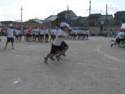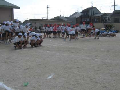 4年生の団体競技「ハリケーン2010」です。3〜4人で棒を持って,コーンを回り,組のみんなの足の下と頭の上を通っていきます。どの色もがんばったので接戦でした。