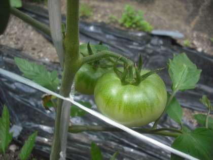 花壇に植えた,キュウリとトマトにかわいい実ができてるよ。