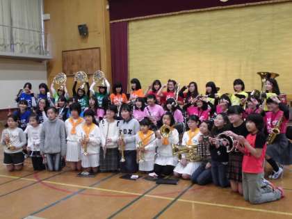 3月11日(土),旭丘中学校吹奏楽部と,旭丘中学校区の待鳳小学校・鳳徳小学校・鷹峯小学校とのジョイントコンサートが開かれました。中学校の吹奏楽ぶの練習に何度か参加し,今日の発表会を迎えました。子どもたちは演奏の前少し緊張していましたが,観客の拍手や手拍子で盛り上がり,コンサートを楽しんでいました。