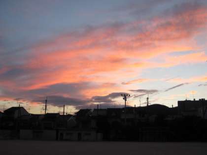 昨夜からの雨も上がり,今日は気持ちのよい秋の一日でした。今日の夕暮れは,空の雲が赤く染まり,秋らしい夕暮れとなりました。学校の運動場から西を望むと,鷹峯三山(天ヶ峯・鷹峯・鷲峯)が民家やビルの合間に見えます。これから,その三山に沈む夕日が美しく見える季節になります。