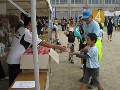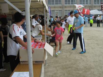 競技に出場する子どもたちの楽しみは,やはり景品のようです。小中学生男女障害物競走を終えた子どもたちが,順位ごとに景品をもらっています。