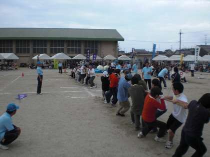 運動会の定番競技,綱引きです。腰を落として息を合わせてしっかり綱を引いてください。