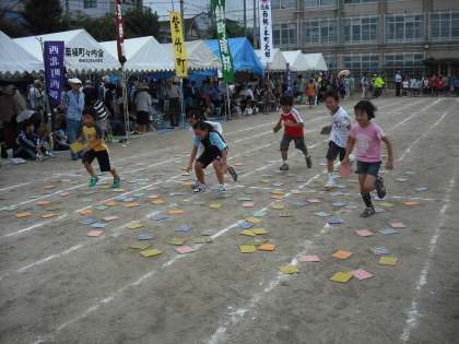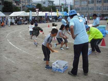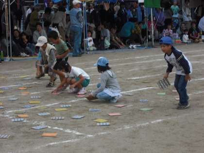 カードを拾って走り,箱の中に入っているカードと色が合えばそのままゴールへ,違っていればもう一度戻ってカードをとってゴールへ走ります。運が左右する競争です。