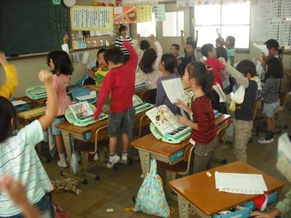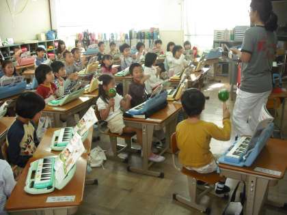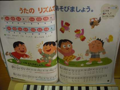 歌ったり音楽に合わせて身体表現をしたりしてリズムの違いを感じ取り,簡単なリズムを表現する学習をしています。