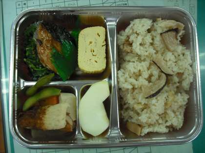 今日は第2土曜日,配食サービスの日です。ボランティアさんたちの手でおいしいお弁当が出来上がりました。今日は季節に合わせて松茸ごはんです。