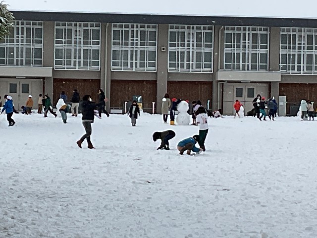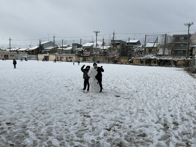 運動場に、雪だるまが何体も出現!!子どもの背丈くらいあるものもできました。