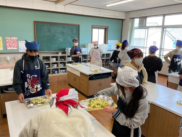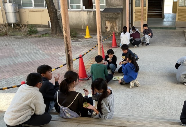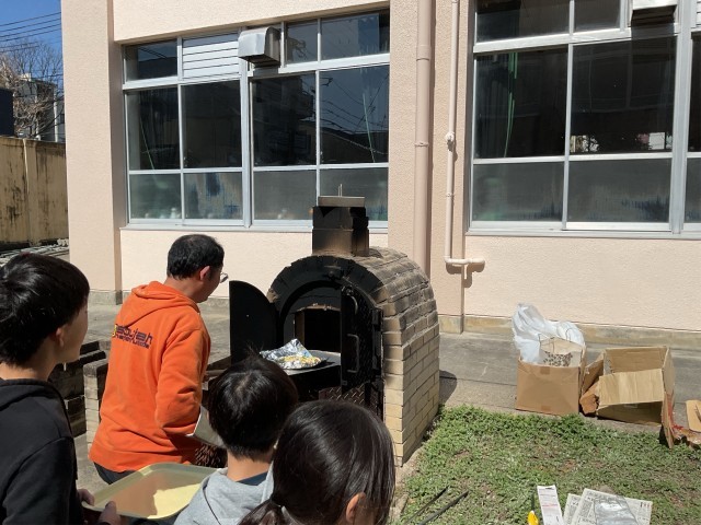 3月12日(木)6年生のピザ作りを実施しました。家庭科室でピザの生地にそれぞれのグループでトッピングをして、中庭にあるピザ窯にもっていきました。ピザ窯は地域の方にお世話になり、1時間前から温めて頂いたので、ピザを入れると2~3分ほどで焼き上がりました。熱々のピザをその場で食べると口々に「おいしい!」と声を上げていました。卒業前の素敵な思い出になったと思います。