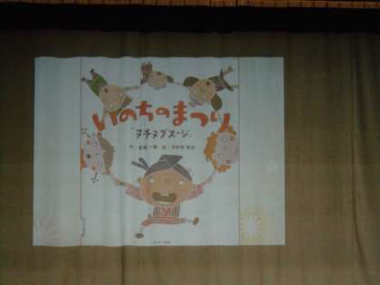 次に,「いのちのまつり」の絵本の読み聞かせです。ご先祖様がたくさんおられること,いのちはつながっていること…。