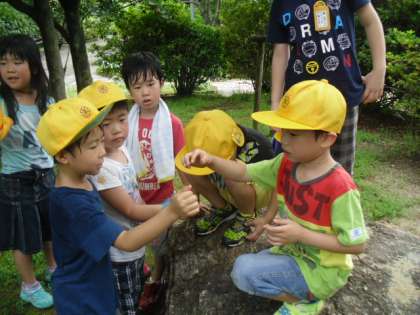 カタツムリやアゲハチョウ,モンシロチョウ,カマキリの赤ちゃんも見つけることができました。セミがたくさん鳴いていましたが,子どもたちが近づくとピタッと鳴きやみます。不思議でした。ウグイスの鳴き声もきこえました。