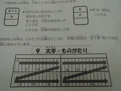 「9から始まる番号がお話の本で,913は日本のお話,933は外国のお話です。Eは,絵本です。お話の本は,この2つの分類のところに,作者の名前の五十音(あいうえお)順に並んでいます。」