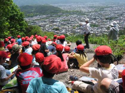 舟山はなかなか急な斜面でしたが、子どもたちは足元に注意しながら元気に登っていました。とてもいいお天気で、舟山の上からは京都市内がきれいに見渡せました。登りきって振り返ると飛び込んできた絶景に子どもたちは思わず、「うわーっ!きれいー!!」「高いー!!」と歓声を上げていました。京都市内を地図と見比べながら見下ろして、かも川や大文字、京都駅や船岡山などいろいろなものを発見していました。登りきって頂上で食べたお弁当は格別のおいしさでした。学校から舟山まで行きも帰りもたくさん歩いてとてもいい汗をかきました。