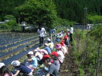 静原に着くと,静原小学校で休憩をさせていただいて,堀内さんの畑に行きました。鳴門金時とべにはるかの二種類を植えました。一人三本の苗を,教えていただいた方法で植えました。堀内さん・上坊さん・寺井さんに教えていただいて無事に終わりました。秋の収穫が楽しみです。
