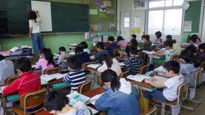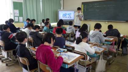 2年生は算数で,時間の学習をしています。ノートをしっかりと書いています。6年生は外国語活動で,英語の自己紹介を聞いて,内容を考えています。