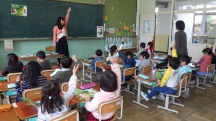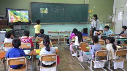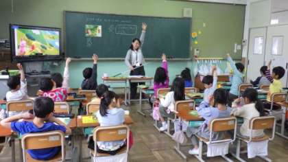 教科書の挿絵を見て,いろいろなものを見つけたり,指し示しながら発表したりしています。