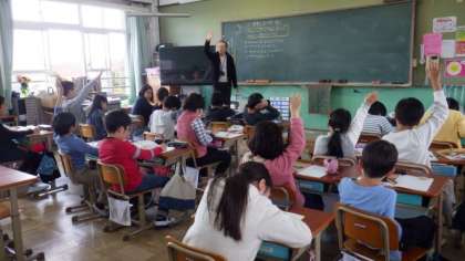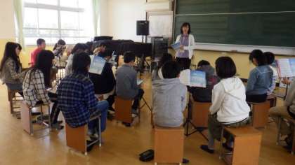 6年生は,音楽室で歌の学習をしています。4年生は理科で,生き物や植物について見つけたことを発表しています。
