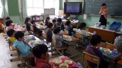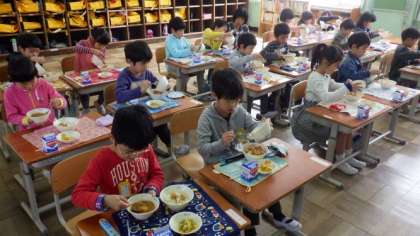今日の給食は,中食器に入れたチキンカレーを,ごはんの上にかけて食べました。スプーンを使って,上手にルーをかけていました。サービスホールで給食調理員さんに「給食おいしかったです。」と話す子どもたちがたくさんいました。