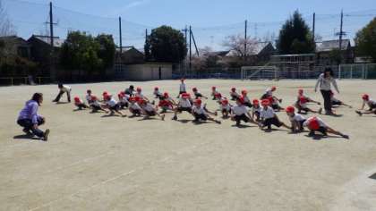 みんなで準備運動をした後,50mのタイムを計りました。