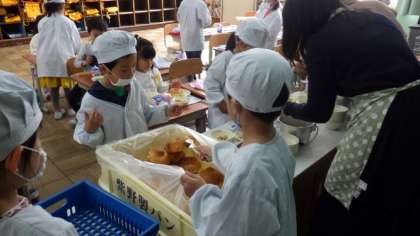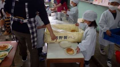でした。1年生も少しずつ給食当番の仕事に慣れ,上手に配膳していました。