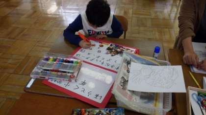 5月に予定している支部「みんなよろしく大会」に向けて,自己紹介カードをつくっています。自分の好きなものについて,丁寧にかいていました。