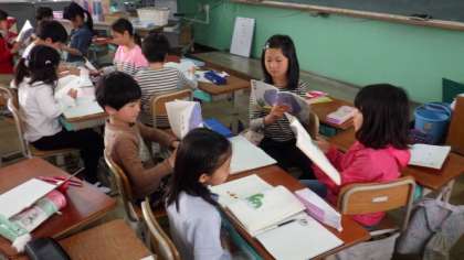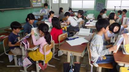 グループで音読発表会の練習をしています。