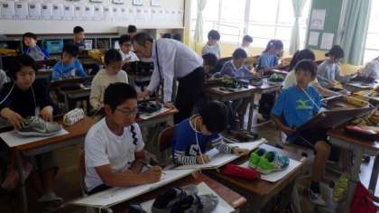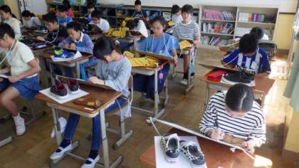 ランリュックや靴など,自分がいつも使っている物をデッサンしています。細かい部分までよく見て描いています。