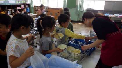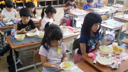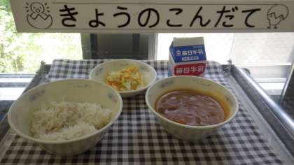 給食のカレーのルーは,手作りです。1年生もおいしそうに食べていました。片付けにもだんだん慣れてきました。