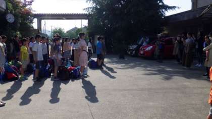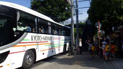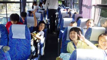 出発式の後,バスに乗って出発しました。たくさんのご家族の方に見送っていただきました。ありがとうございました。