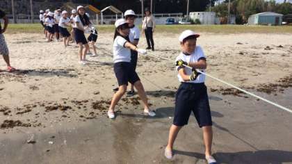 みんなで地引網をひきました。大きな魚がとれて,とてもうれしそうでした。