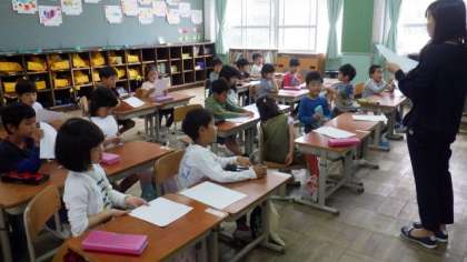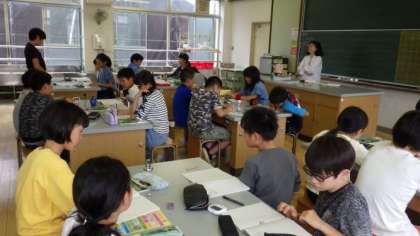 1年生は,たてわり集会で発表する言葉の練習をしています。6年生は理科で,ものの燃焼について学習しています。