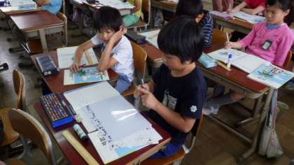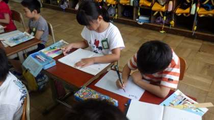 長さの学習をしています。本校では今年度,2年生以上の学級でプラスチックボードとホワイトボードマーカーを購入し,自分の考えを発表する道具として活用しています。2年生も自分の考えを一生懸命ボードにかいていました。