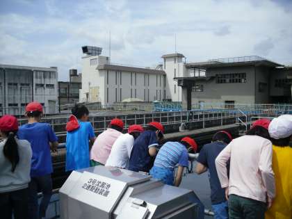 琵琶湖の水を疏水を通して運んできて,その水を飲料水にするために,どのような努力をしているかを見学しました。活性炭を混ぜた黒い水が,どんどん透明で美しい飲み水に変わっていく様子や,飲料水を作る最終過程の急速濾過池の働きもしっかり見学できました。濾過池の砂を洗う作業を見て,子どもたちは歓声をあげていました。濾過で使った砂から真っ黒な汚れが吹き出し下水に流されていき,再び急速濾過が始まるのは大変見ごたえのある光景でした。子どもたちに浄水場の働きが実感できるように,見学課程を工夫していただいたことがよく分かりました。京都市の水道水は1立方メートルが160円という大変安価な値段であるもわかりました。