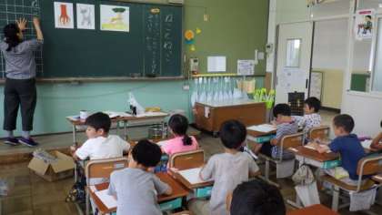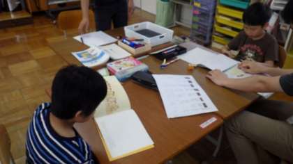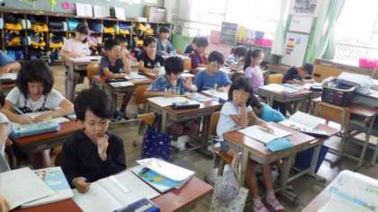 3組は,絵本を読んだり,算数の問題に取り組んだりしています。1年生は国語で,小さい「っ」のつく言葉の学習をしています。2年生は算数で,ひき算の筆算の学習をしています。