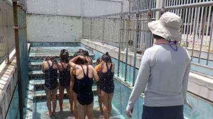 今日から,プールでの学習を始めました。今日は,1年生と3組が水慣れの学習をしました。はじめにシャワーを浴びて,準備運動をしました。