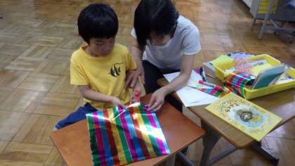 3組は,はさみを使って七夕かざりをつくっています。6年生は社会で,武士はどのようにして力をつけてきたのかについて調べたことを発表しています。1年生は図工で,生活の中で,楽しかったこと,うれしかったことなどを,パスを使って絵で表しています。