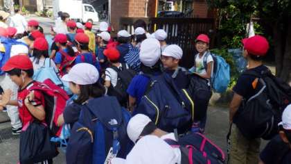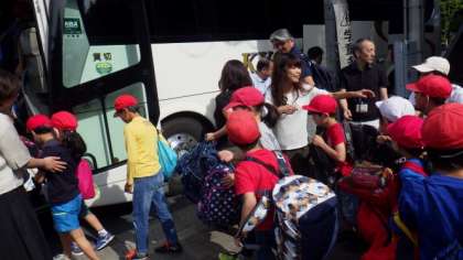 今日から4年生が野外学習へ行きます。体育館で出発式をした後,バスに乗って学校を出発しました。たくさんのご家族の方に見送りにきていただき,ありがとうございました。