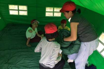 昨日はバンガローで宿泊しました。今日はテントで宿泊します。明るいうちにシーツなどを準備しました。