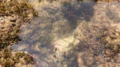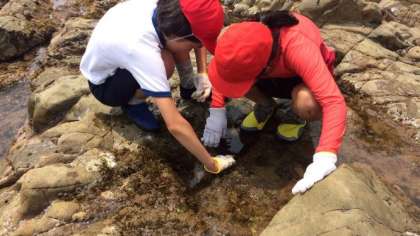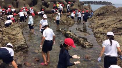 お話を聞いた後は,みんなで磯観察をしています。潮だまりにいろいろな生き物がいます。