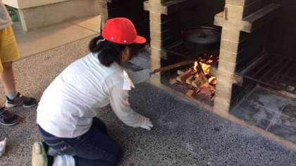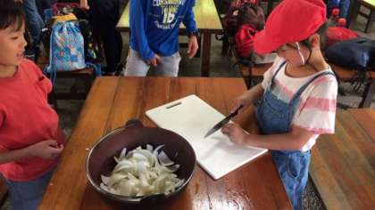 野外炊事を開始しました。みんなで協力して,今日の夕食をつくります。火の係・材料切り・調理など,グループで役割分担してつくっています。