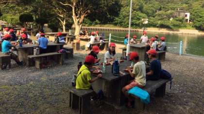 野外炊事場で朝食をとっています。