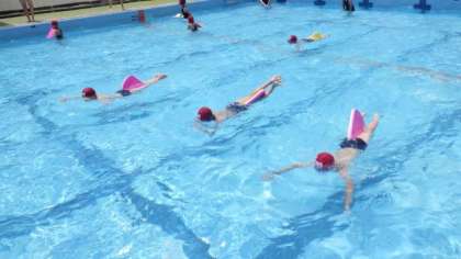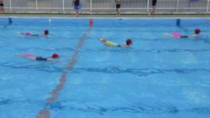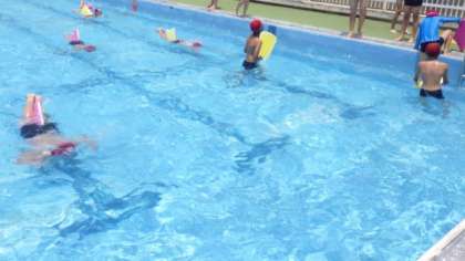 3・4時間目は5年生が水泳学習を行いました。ビート板を使って,平泳ぎの手の動きを練習しています。