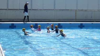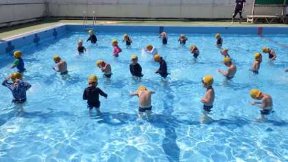 プール学習を行いました。プールの中を「かに歩き」で歩いたり,ロケットになって水中からジャンプしたりしました。「ふしうき」や「けのび」の練習もしました。