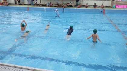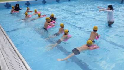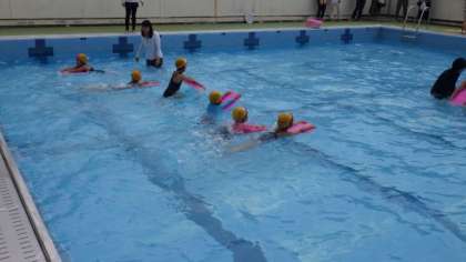 参観デーで,水泳学習の様子を参観していただました。「カニあるき」や「イルカジャンプ」などをがんばっていました。また,ビート板を使った練習もしました。