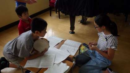 自分たちのつくったリズムに合う楽器を選んで,リズムアンサンブルをつくっています。