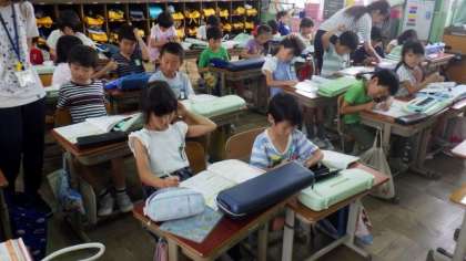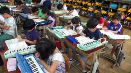 リズムにあわせて楽しく歌ったり,音符や休符などの記号の書き方を練習したりしています。