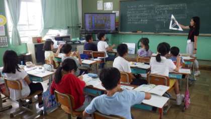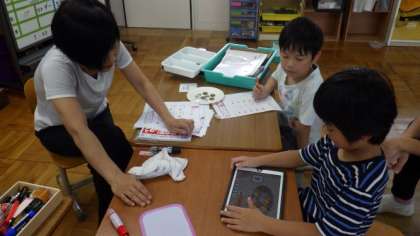 3組は算数で,ワークシートやタブレットを使って学習しています。タブレットは,絵を見て音声を聞きながら,数を数えるアプリケーションを使って学習しています。3年生は,数直線を使って,大きな数を比べる学習をしています。4年生は算数で,垂直についての学習をしています。