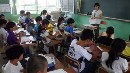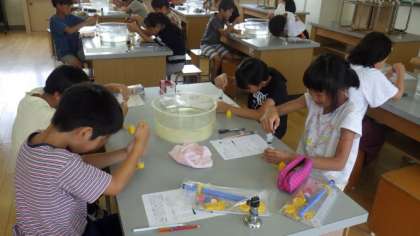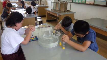 4年生は理科で,閉じ込めた水を圧したときの様子から,閉じ込められた水の性質を考えています。5年生は総合的な学習の時間で,明日のスチューデントシティ学習当日の流れや持ち物などを確認しています。