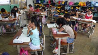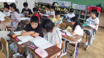 6年生は算数で,面積の求め方の工夫についてペアで説明しています。4年生は算数で,垂直について学習しています。3年生は国語で,物語文の学習をしています。