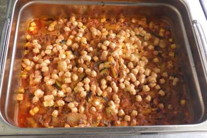 「ボロネーゼ」とは,イタリアのボローニャ地方の家庭料理で「肉が入ったソースを使った料理」のことをいいます。今日はそこへ,夏においしいズッキーニとなす,スチームコンベクションオーブンで焼いたジャガイモをのせました。さらにチーズをのせて,スチームコンベクションオーブンで焼いて仕上げました。