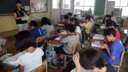 5年1組は理科で,条件を変えた植物の生長のちがいについてまとめています。5年2組は社会で,米作りについて学習しています。6年生は国語で,昔話「河鹿の屏風」の学習をしています。
